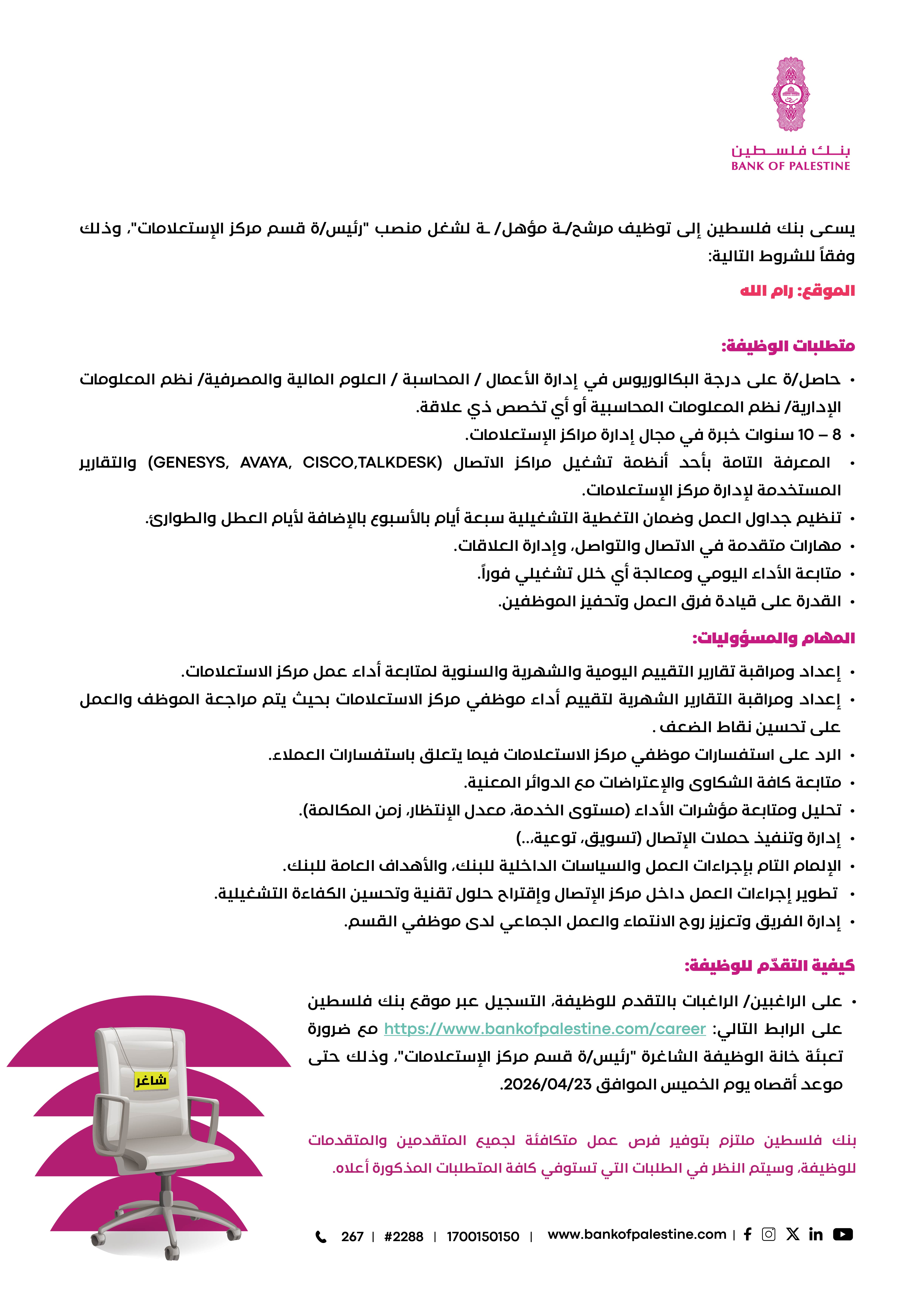 رئيس/ة قسم مركز الاستعلامات | Head of Contact Center