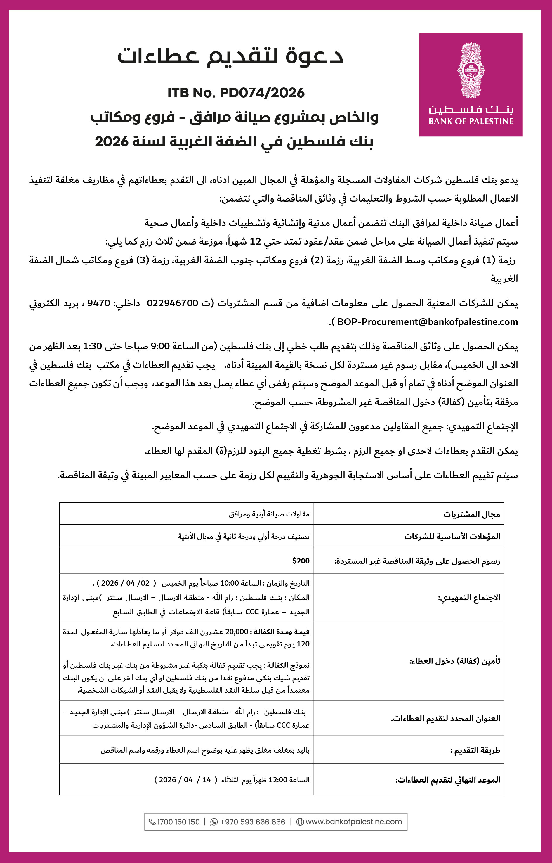 Based on transparency and compliance with laws and regulations, Bank of Palestine is committed to publishing all public offers in newspapers and on its website so that the largest possible number of those interested in these offers can view and participate in them.Accordingly, applicants are required to attach the necessary information to the offer form, abiding by the relevant terms and conditions.